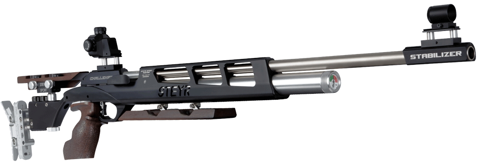 Kaliber 4,5 mm /.177, 7,5 Joule, Pressluftantrieb, kugelgelagerter Elektronik-Abzug, STEYR Stabilisator, höchst variabler Vorder- und Hinterschaft (Vorderschafthöhe ca. 71-86 mm), zusätzliche lange Stangen für höheren Vorderschaft ca. 81-118 mm, stufenlos verstellbarer Griff, einfache Justierung der Mündungsgeschwindigkeit, stufenlos verstellbare Schaftschränkung, Trockentrainingseinrichtung, Druckbehälter mit integriertem Manometer, komplette Visierung mit höhen- und seitenverstellbarer Visierlinienerhöhung, Korntunnelgröße 22 mm, Schaftgewichte. Abnehmbarer Hinterschaft für bequemen Transport in der 98-cm-Gewehrtasche (Zubehör). Lieferung im 119-cm-Kunststoffkoffer (1-KO-60) mit Bedienungsanleitung, Werkzeug, Füllstück und STEYR Tin Clip.